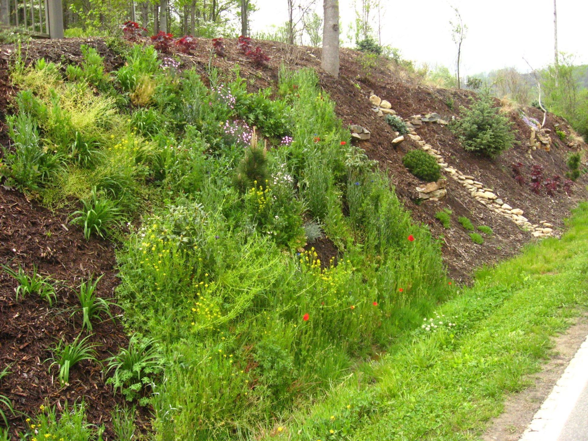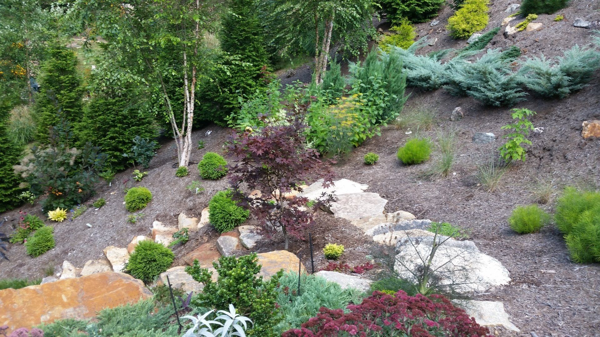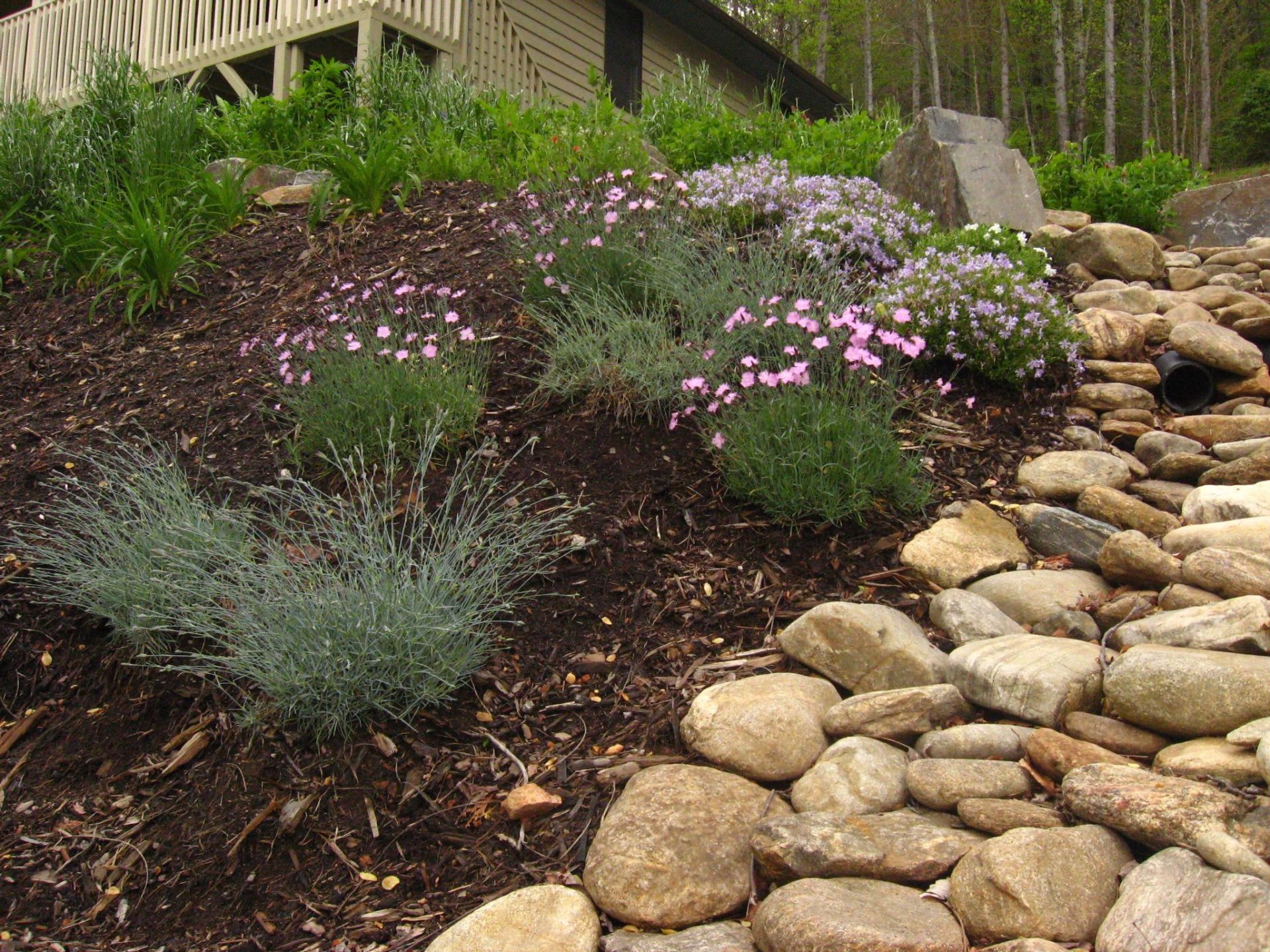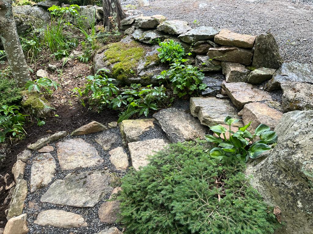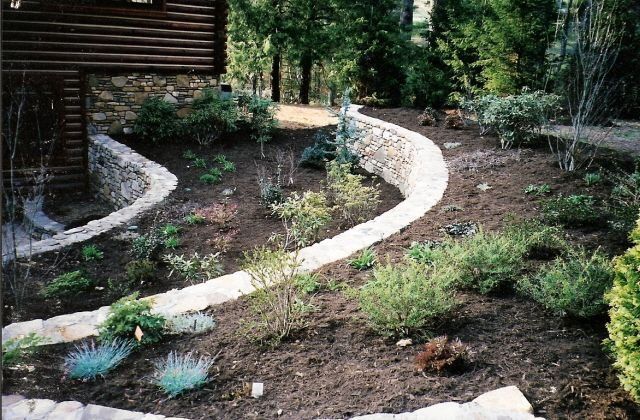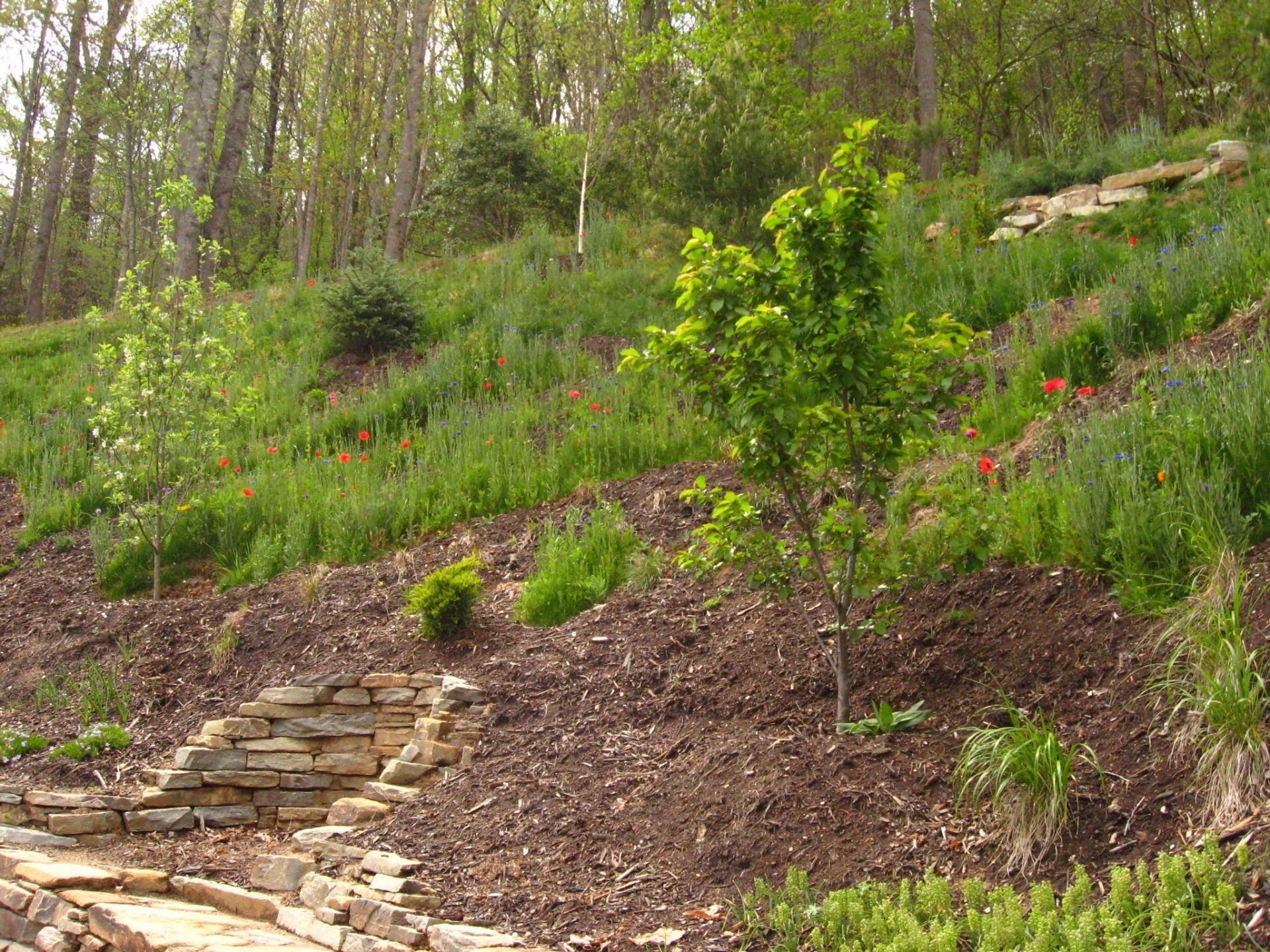 (PLEASE NOTE: PLANTING WORK IS INDEFINITELY ON HOLD AT THIS TIME.) In our 3 General Landscaping photo galleries you will get a feel for the breadth, quality and variety of our work: Stone and timber retaining walls, eyebrows, walkways, stepping stones, stairways, patios, wildflower meadows, slope plantings, boulders and hardscaping, annuals, perennials, lawn space, terracing, drainage, grading, planting beds and garden beds, trees of all types and sizes, native plants and shrubs, edible gardens, fire pits, outdoor fireplaces, outdoor kitchens, courtyards, cottage gardens, play areas, drainage work, ponds and water features... Please visit our other photo galleries