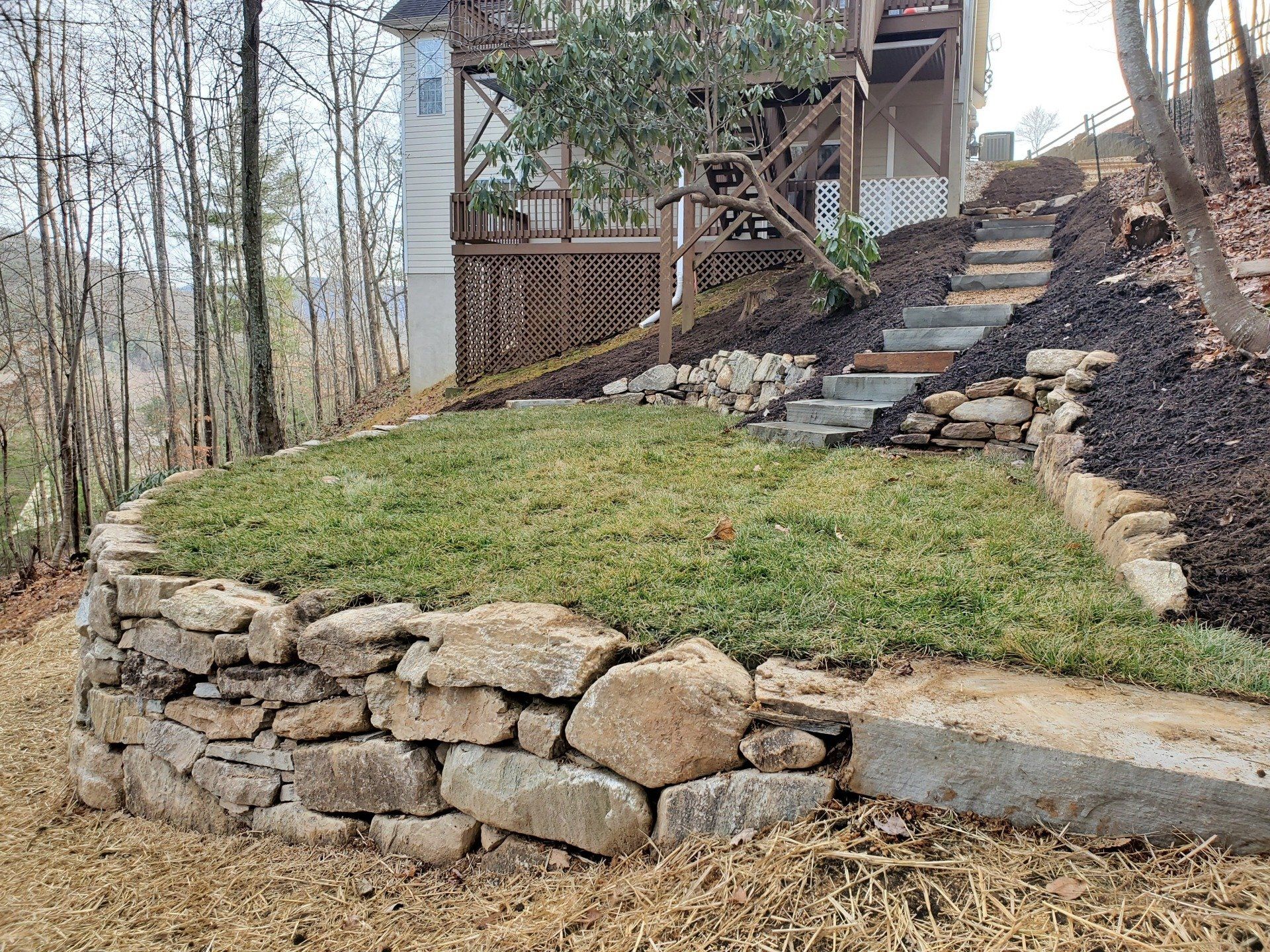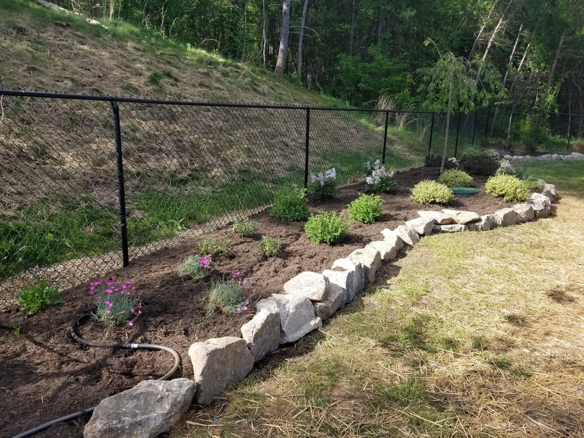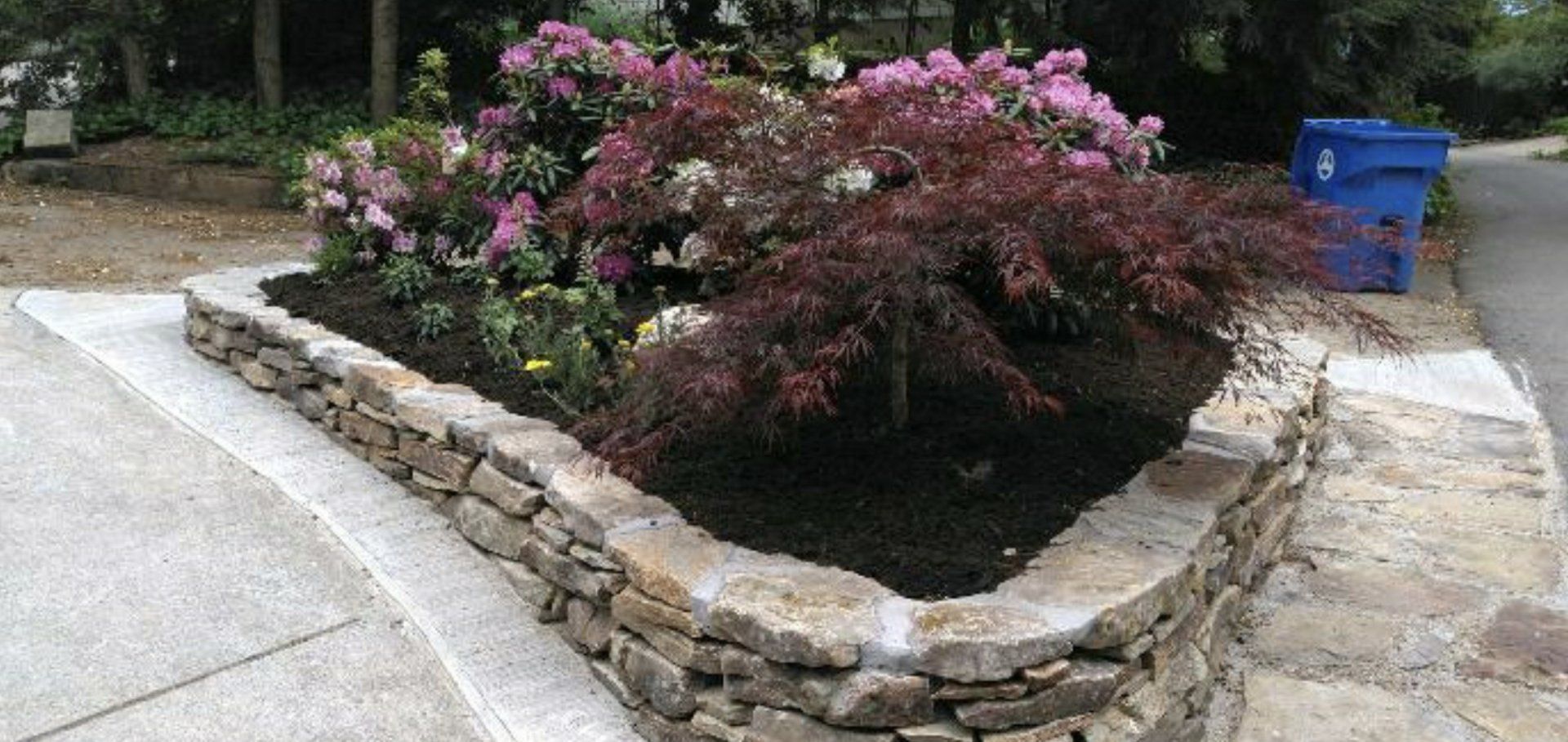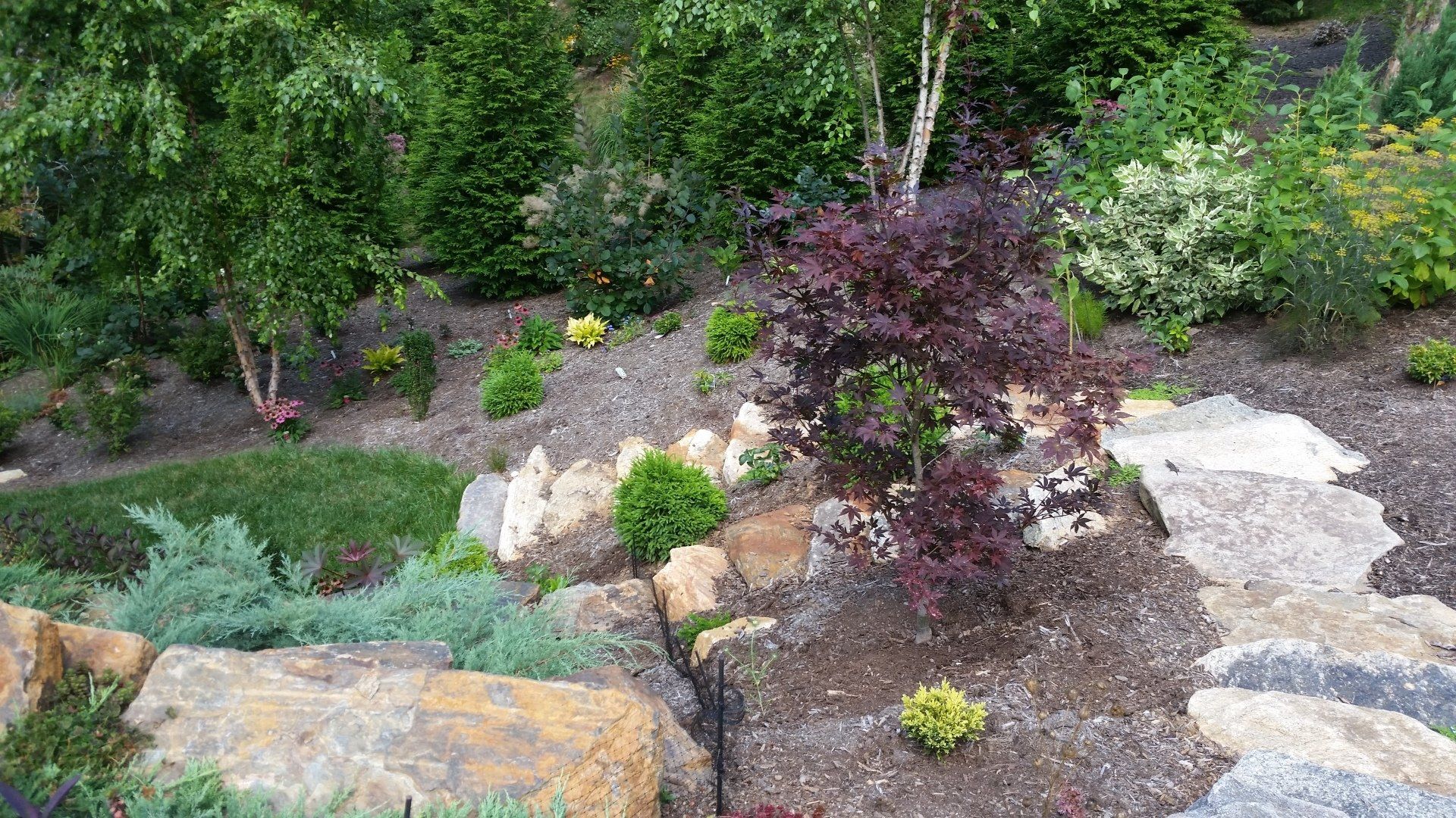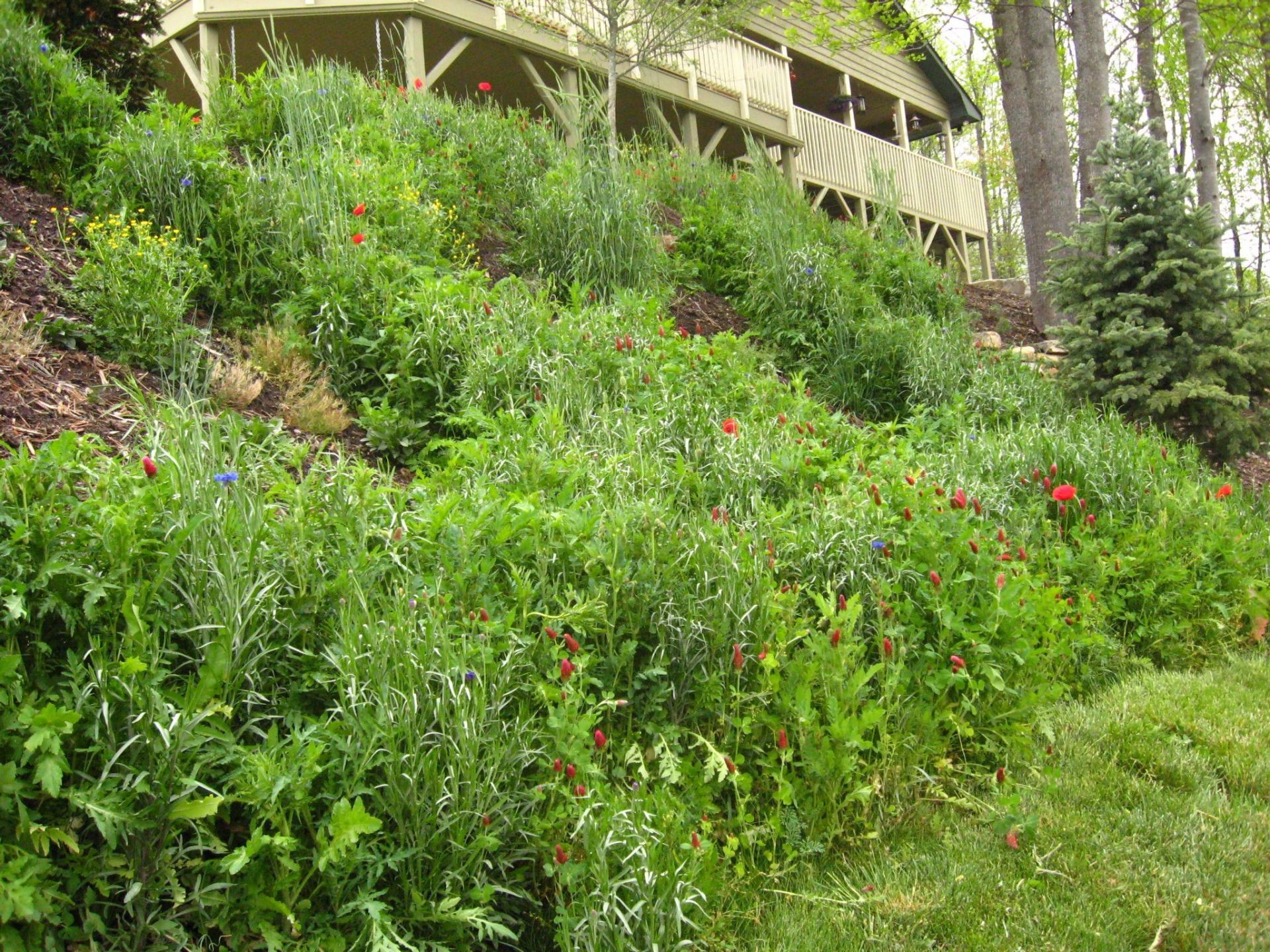 (PLEASE NOTE: PLANTING WORK IS INDEFINITELY ON HOLD AT THIS TIME.) In our 3 General Landscaping photo galleries you will get a feel for the breadth, quality and variety of our work: Stone and timber retaining walls, eyebrows, walkways, stepping stones, stairways, patios, wildflower meadows, slope plantings, boulders and hardscaping, annuals, perennials, lawn space, terracing, drainage, grading, planting beds and garden beds, trees of all types and sizes, native plants and shrubs, edible gardens, fire pits, outdoor fireplaces, outdoor kitchens, courtyards, cottage gardens, play areas, drainage work, ponds and water features... Please visit our other photo galleries