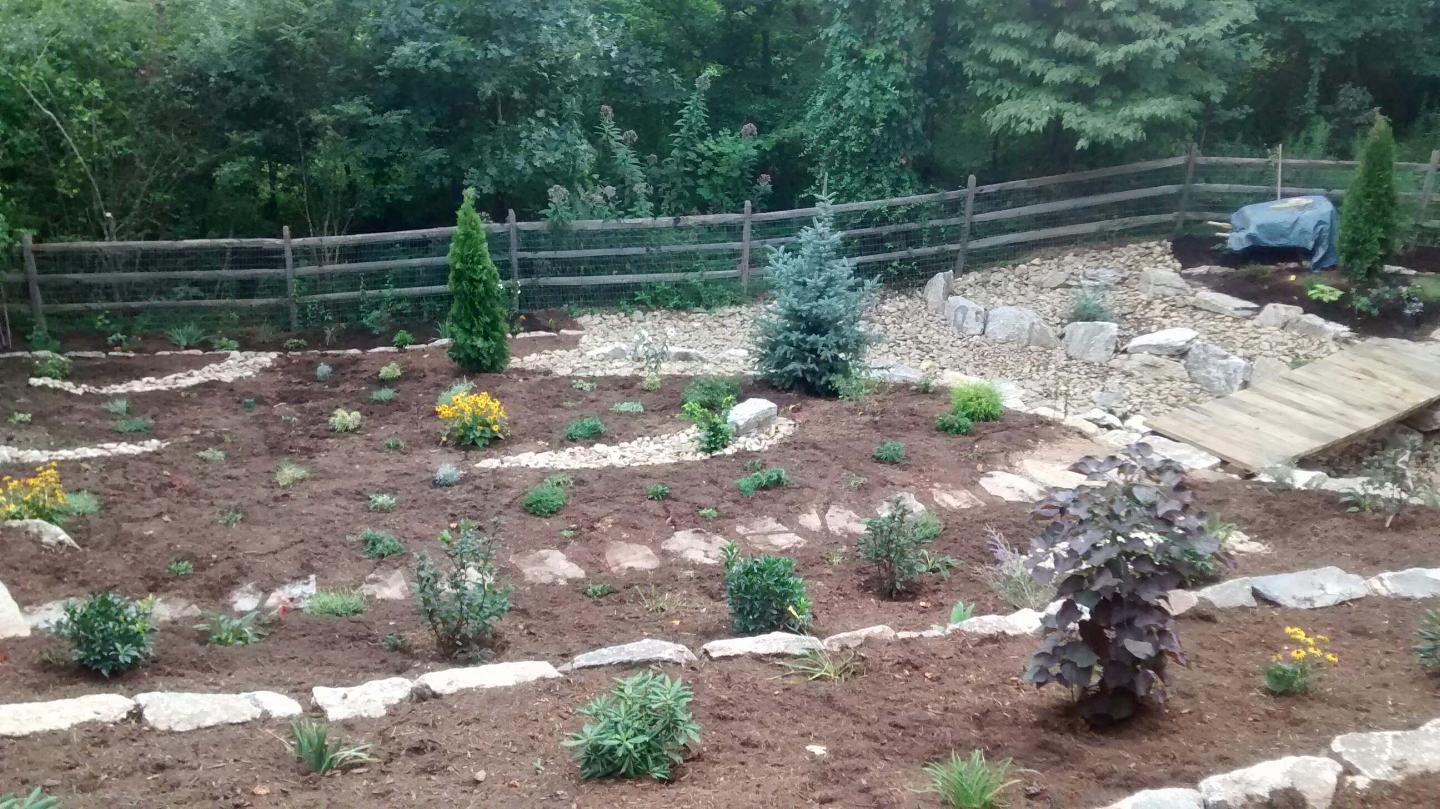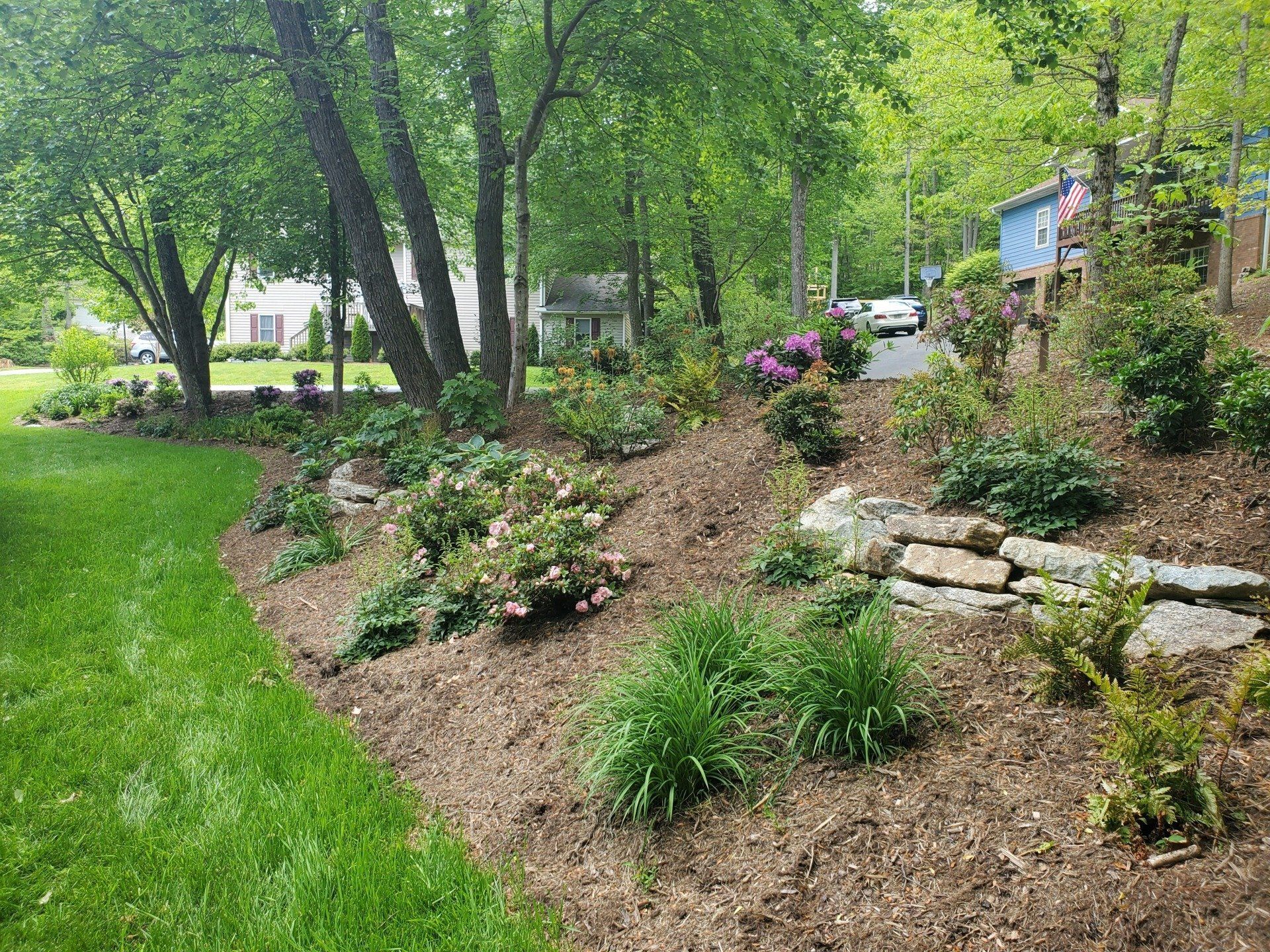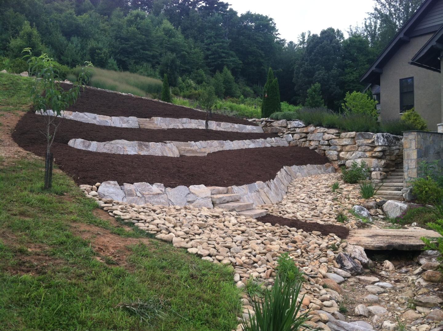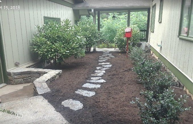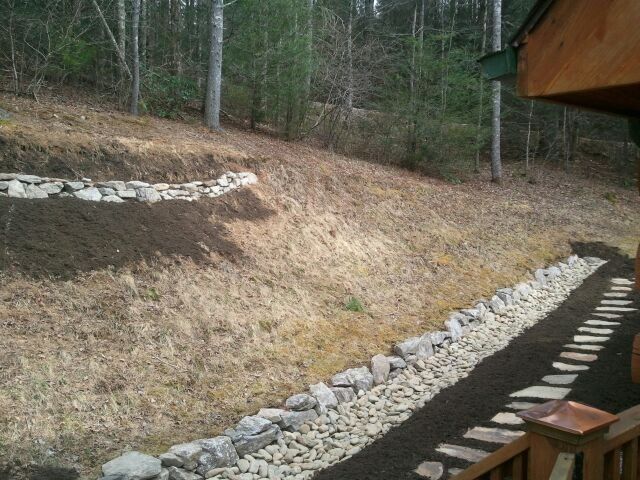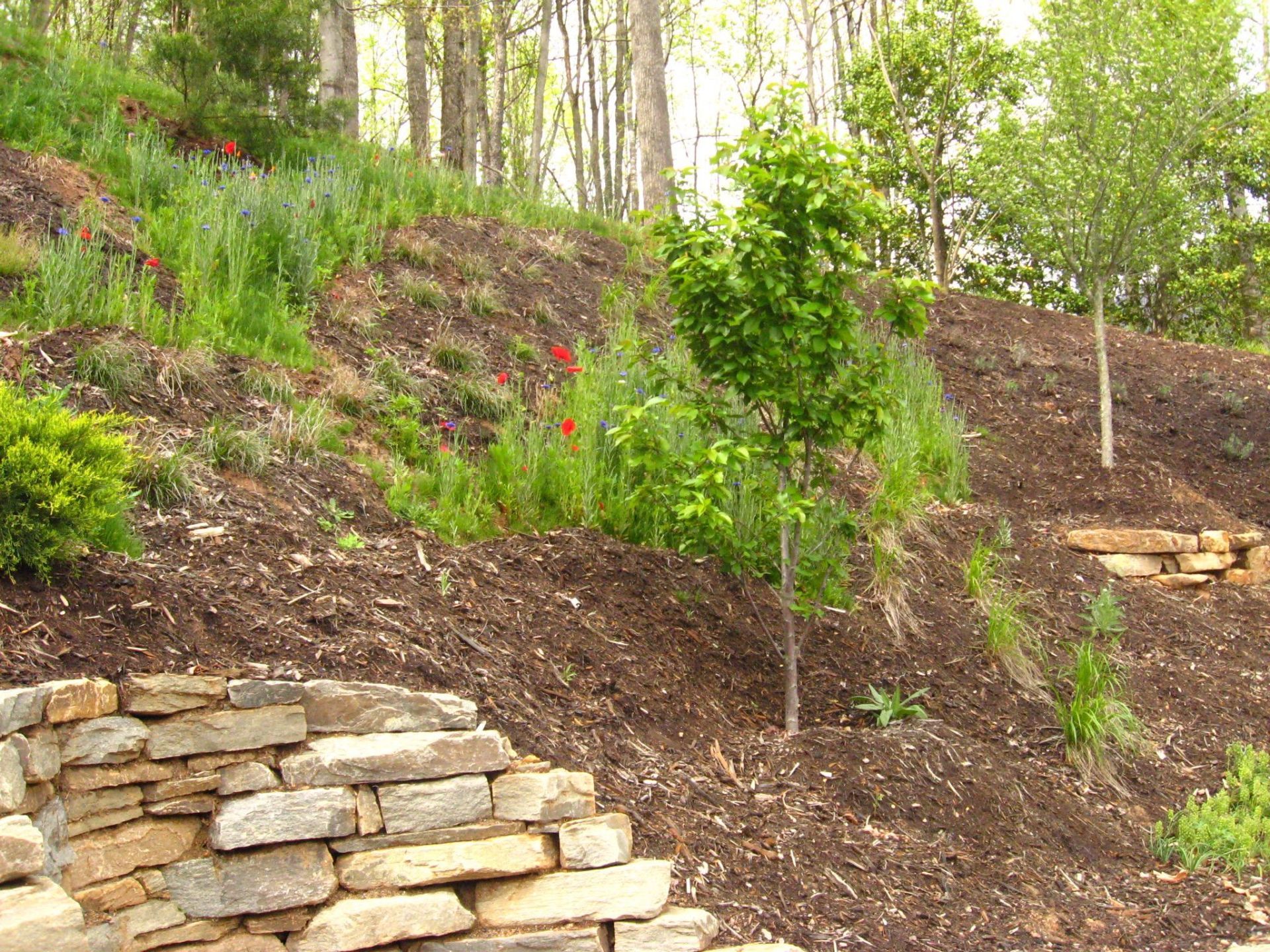 (PLEASE NOTE: PLANTING WORK IS INDEFINITELY ON HOLD AT THIS TIME.) In our 3 General Landscaping photo galleries you will get a feel for the breadth, quality and variety of our work: Stone and timber retaining walls, eyebrows, walkways, stepping stones, stairways, patios, wildflower meadows, slope plantings, boulders and hardscaping, annuals, perennials, lawn space, terracing, drainage, grading, planting beds and garden beds, trees of all types and sizes, native plants and shrubs, edible gardens, fire pits, outdoor fireplaces, outdoor kitchens, courtyards, cottage gardens, play areas, drainage work, ponds and water features... Please visit our other photo galleries