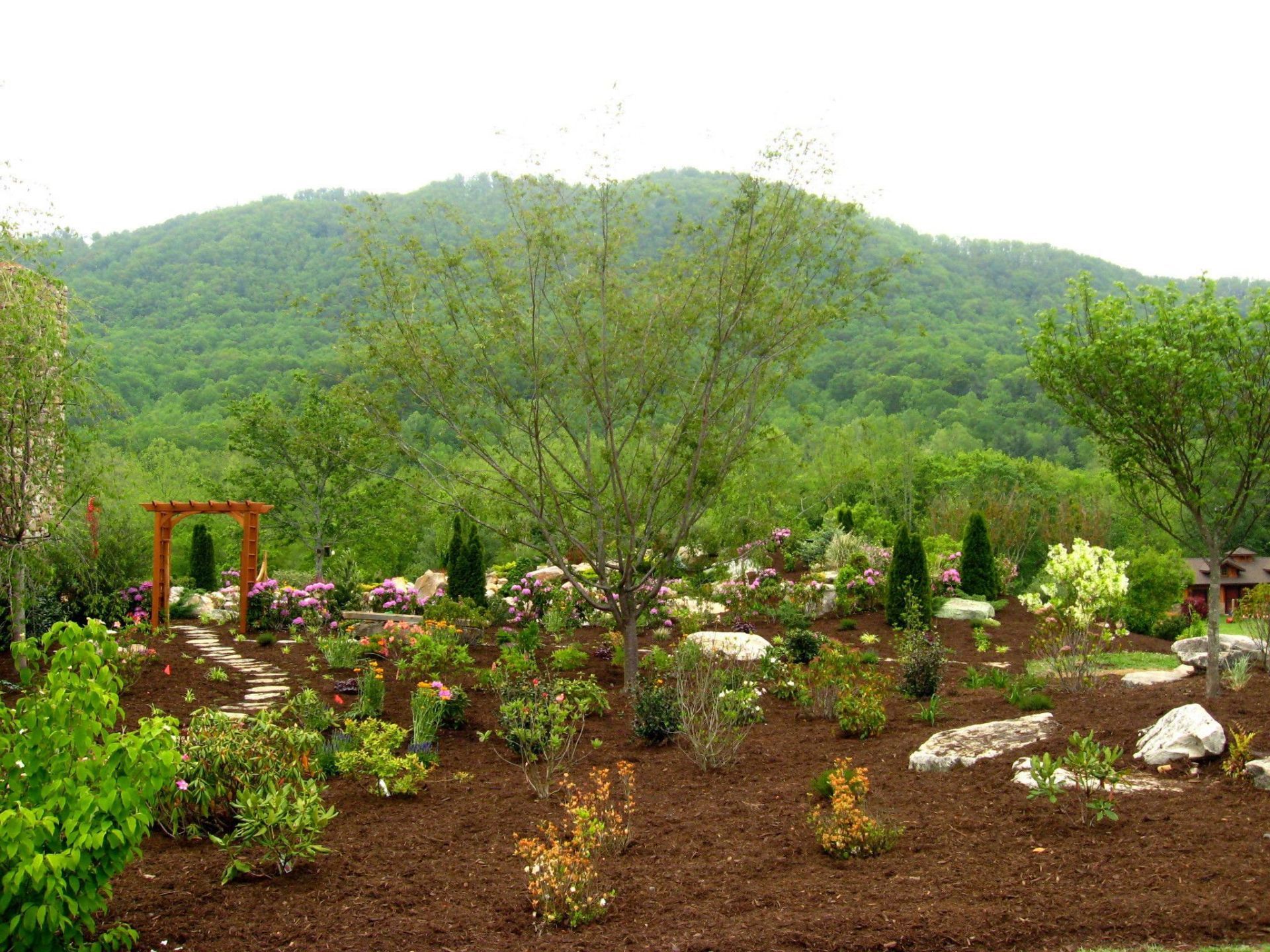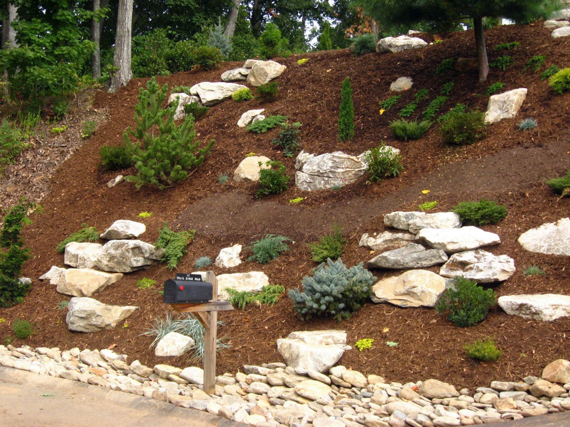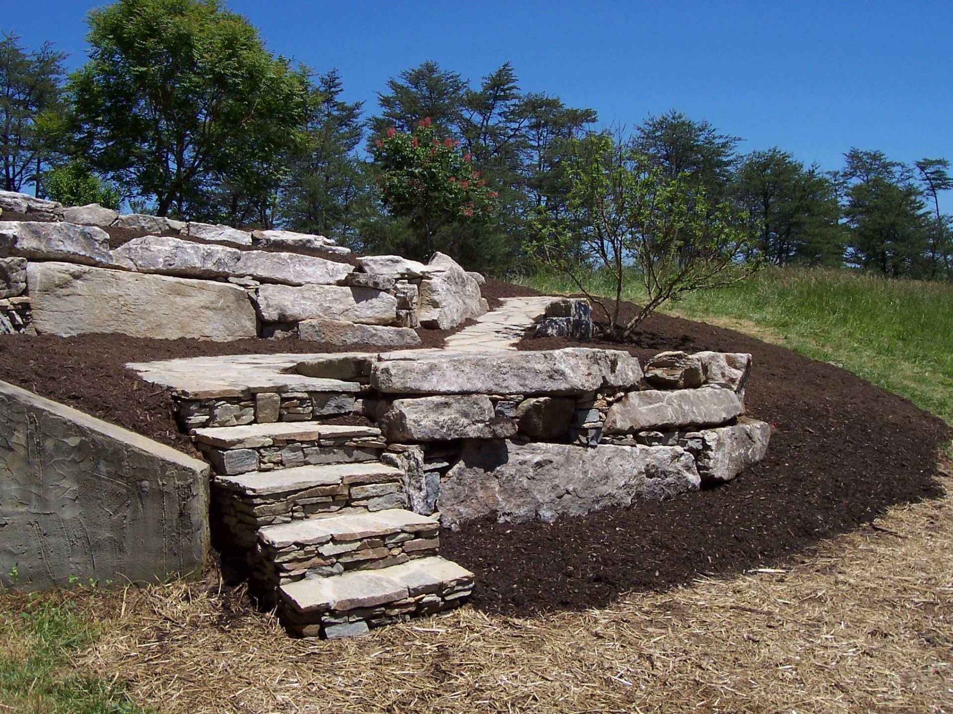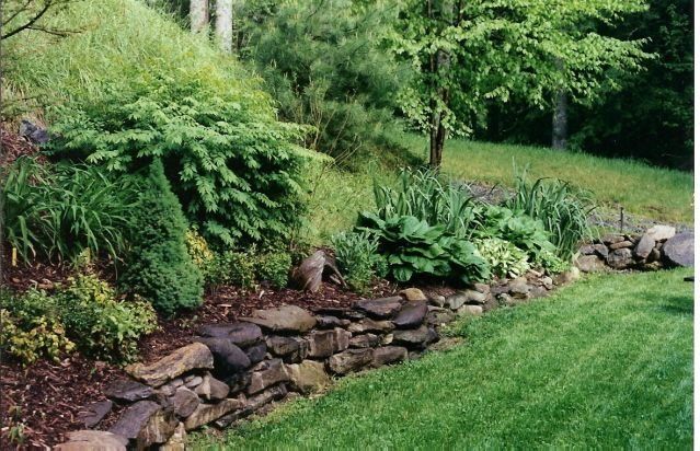 (PLEASE NOTE: PLANTING WORK IS INDEFINITELY ON HOLD AT THIS TIME.) In our 3 General Landscaping photo galleries you will get a feel for the breadth, quality and variety of our work. stone and timber retaining walls, eyebrows, walkways, stepping stones, stairways, patios, wildflower meadows, slope plantings, boulders and hardscaping, annuals, perennials, lawn space, terracing, drainage, grading, planting beds and garden beds, trees of all types and sizes, native plants and shrubs, edible gardens, fire pits, outdoor fireplaces, outdoor kitchens, courtyards, cottage gardens, play areas, drainage work, ponds and water features... Please visit our other photo galleries